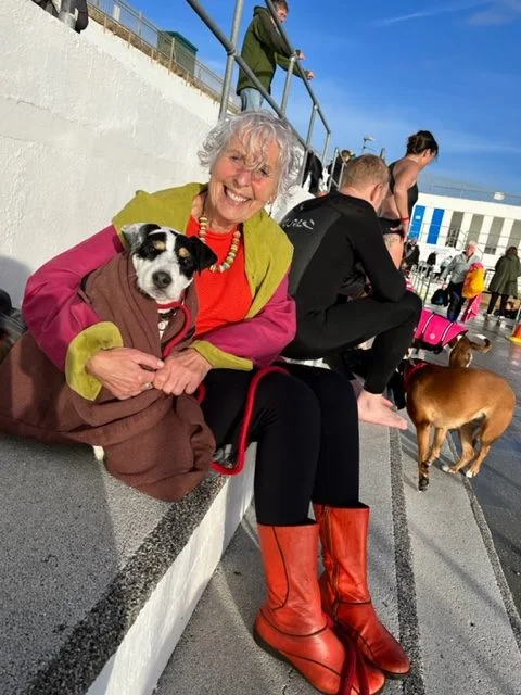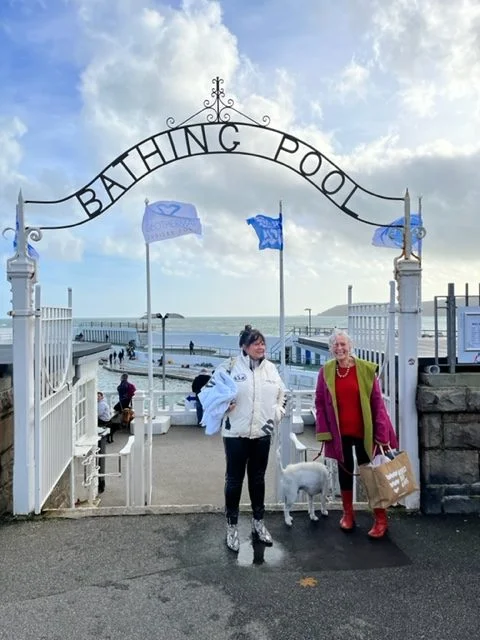 Jubilee Pool is on the famous promenade and a prominent Penzance landmark. A stream of dogs and their owners were coming and going through the famous gates when we arrived. I didn’t quite know what to expect but canines of all sizes and description were milling around in and out of the pool with their owners. The old changing cubicles were a challenge, most of them had no doors, so a bit of fancy towel coverage was required.