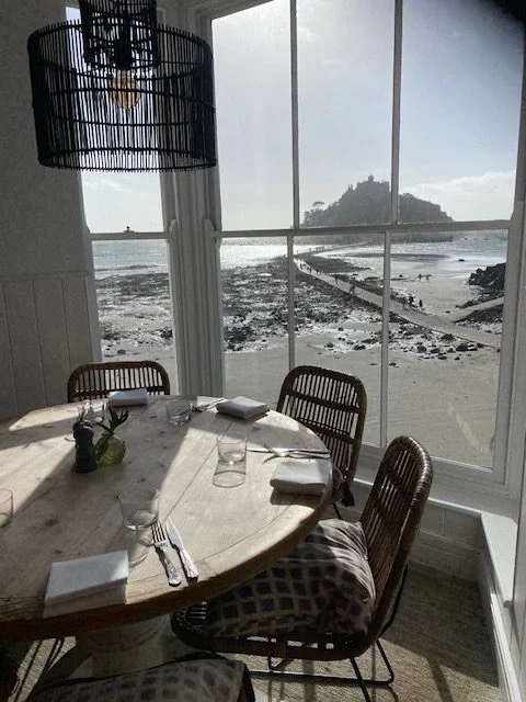 A friend suggested we might go down to Marazion first for lunch at the Godolphin hotel, fabulously situated on the coast with views over St Michael’s Mount and miles of glorious beaches. Dogs are made very welcome here with their own water bowl and treats supplied whilst their owners tuck in to their meal.