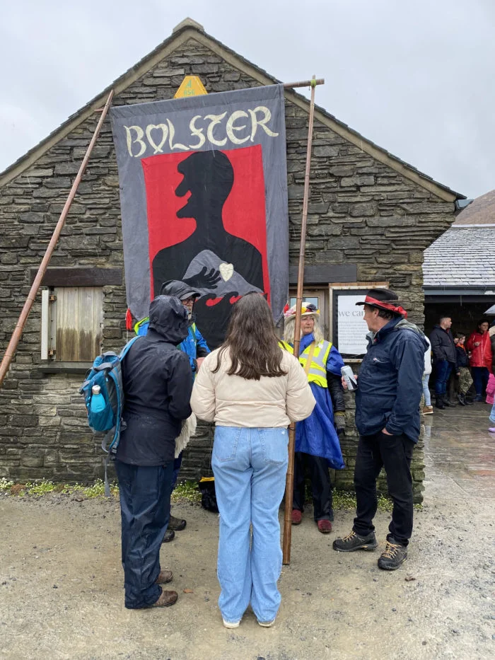 Several people hold a Bolster Pageant banner wearing traditional Cornish hat wear.